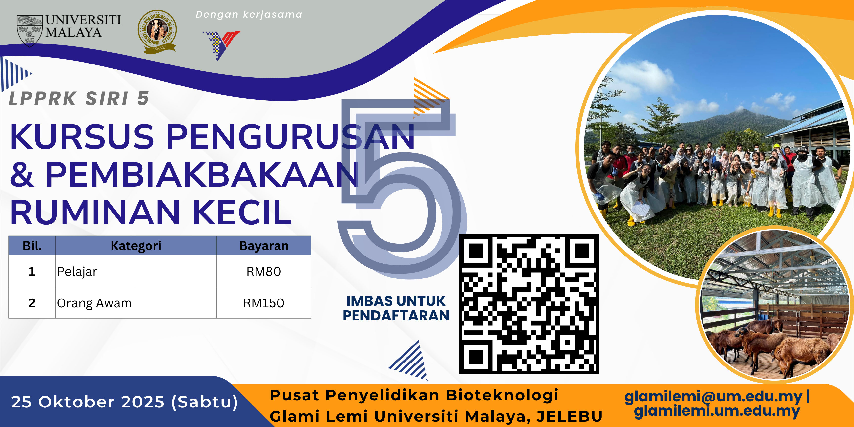 Pusat Penyelidikan Bioteknologi Glami Lemi Universiti Malaya (PPBGLUM) ingin menjemput Tuan/Puan bagi menyertai Kursus Pengurusan dan Pembiakbakaan Ruminan Kecil Siri 5. Berikut maklumat latihan: